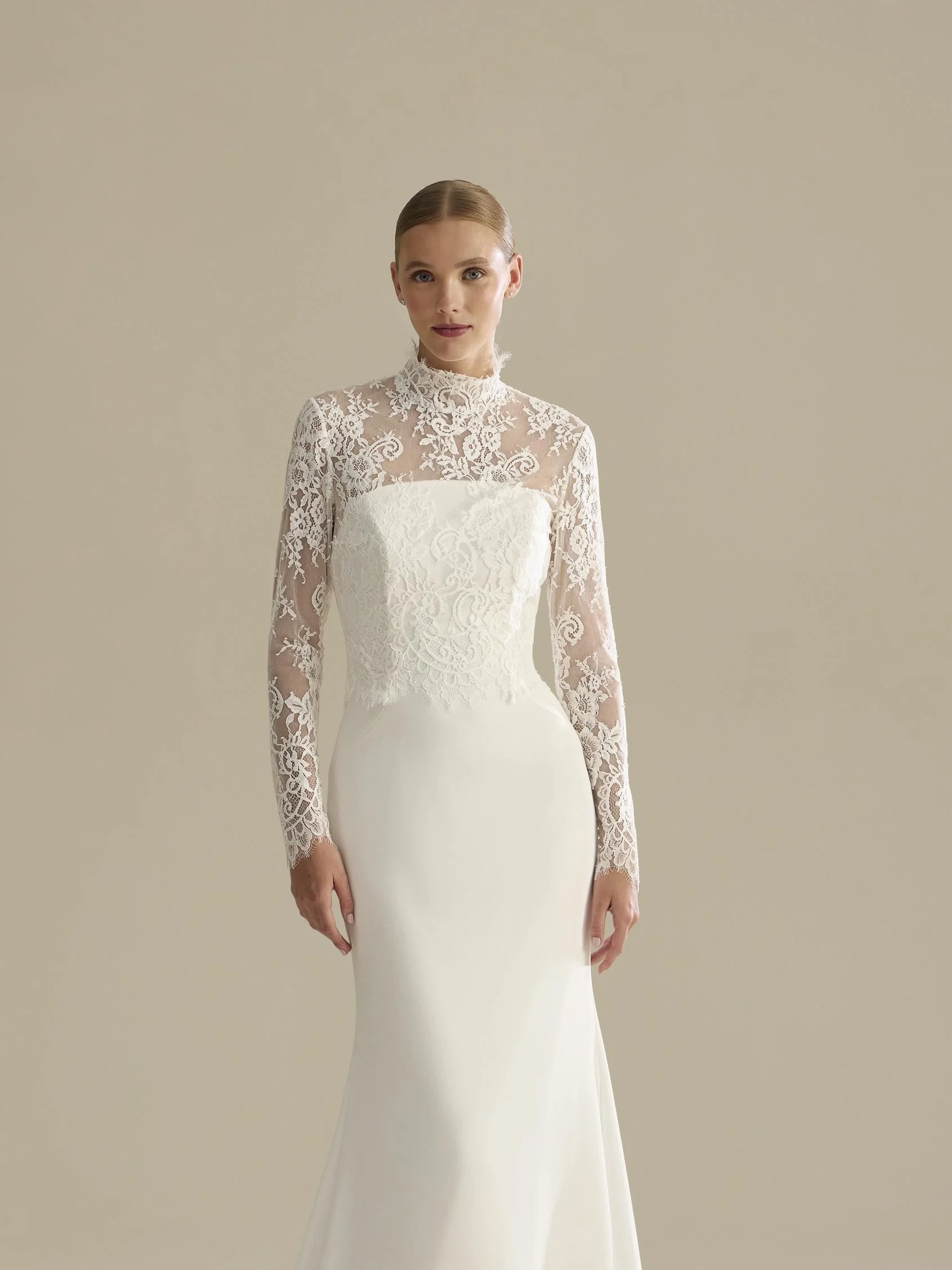 | CASAQUETO RENDA CHANTILLY GOLA ALTA MANGAS COMPRIDAS Disponível para locação e venda |