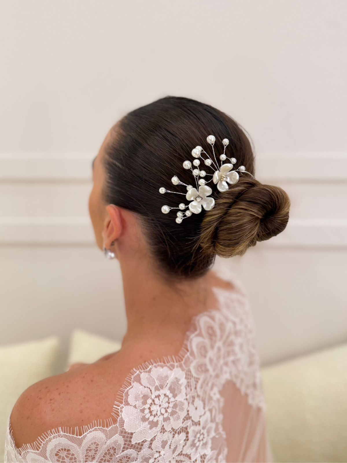 GRINALDA COM ACABAMENTO EM PENTE COM FLOR EM RESINA PEROLADA E DETALHES EM PÉROLA. VENDIDAS POR UNIDADE.