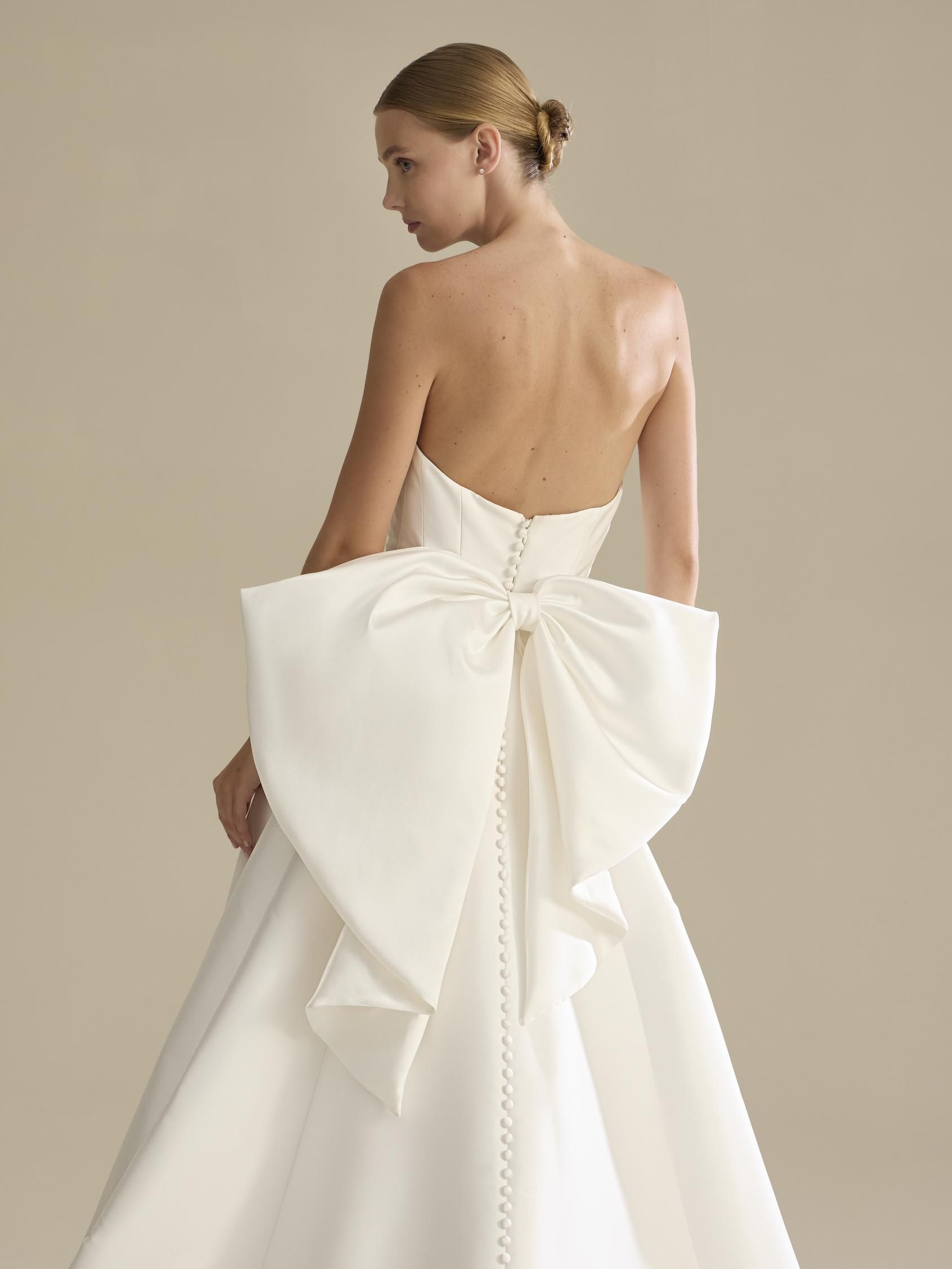 Adicional de laço Off white estruturado comprimeto curto todo em tecido mikado, marca Pronovias. Disponível para locação e venda.