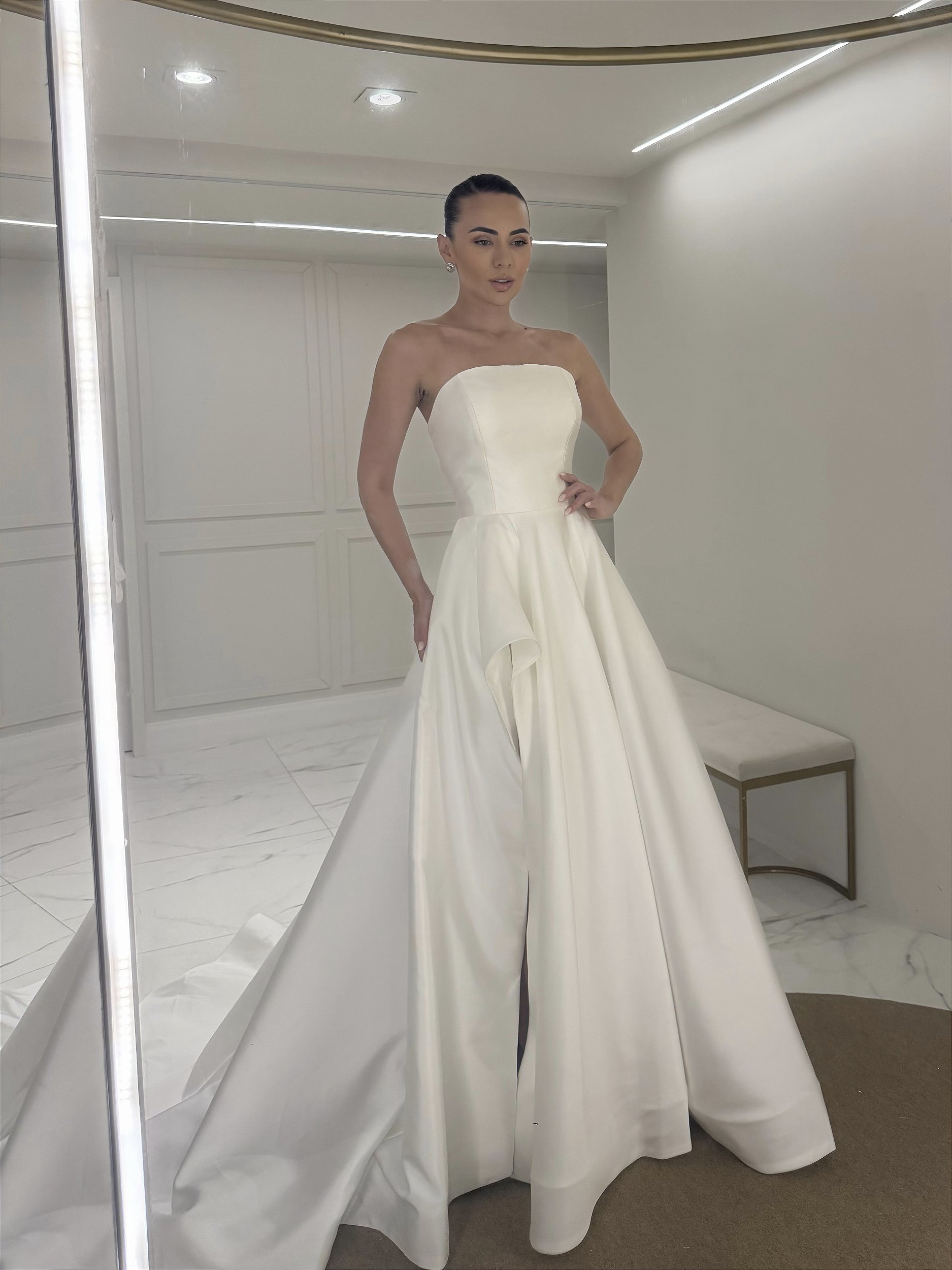 Vestido tomara que caia decote boleado com detalhe em fenda peplum que deixa o caimento da saia ainda mais estiloso e moderno.
