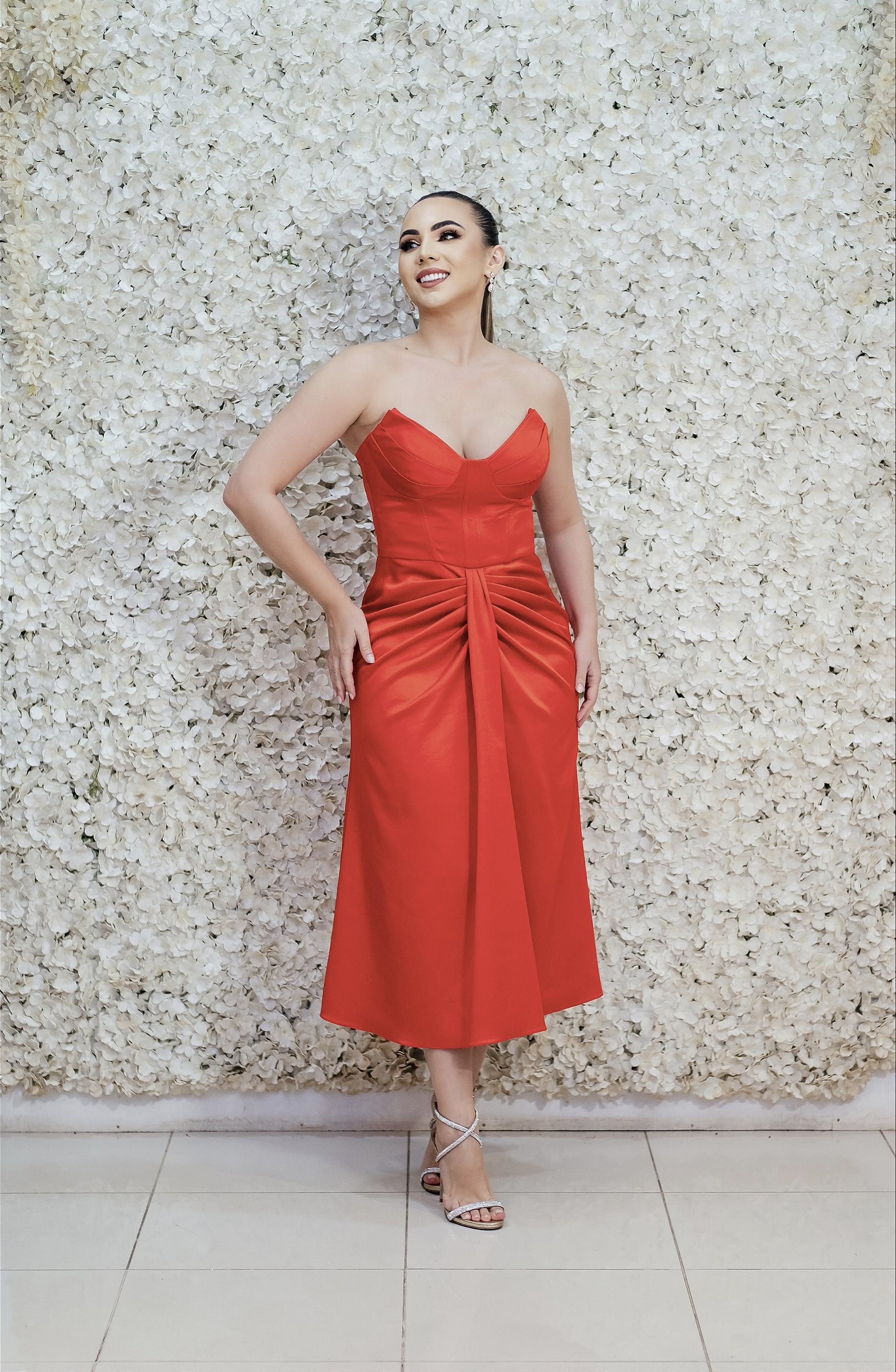 VESTIDO MIDI VERMELHO BUSTO BOJO DRAPEADO DETALHE LAÇO NA SAIA
