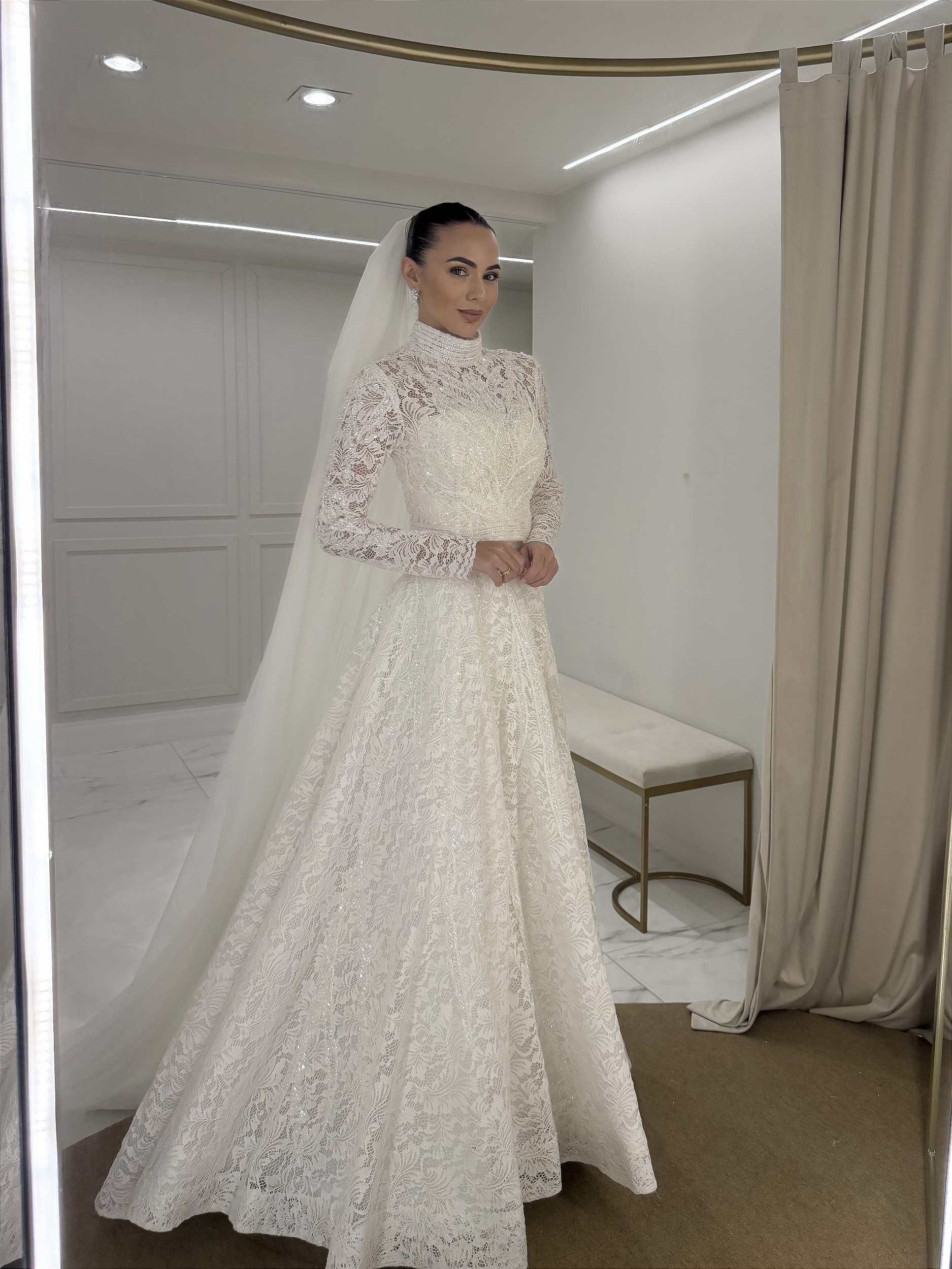 VESTIDO TODO EM RENDA BORDADA COM PEDRARIA E VITRILHOS PRINCESA COM DECOTE TOMARA QUE CAIA E CASACO MANGAS COMPRIDAS GOLA ALTA REMOVÍVEL